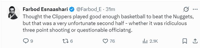 赛后船记Farbod Esnaashari继续吐槽,尽管快船队的整体表现还算不错但还是没能击败掘金,无论是球队一波荒诞的三分出手还是裁判那令人窒息的吹罚尺度。