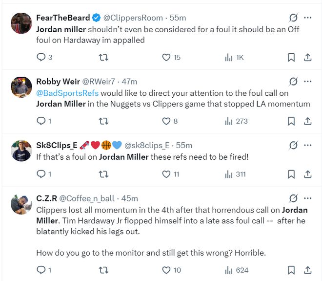 很多的快船球迷也开始吐槽裁判:1.请裁判注意一下,你们吹罚米勒对小哈犯规那球绝对是个误判,那个球破坏了快船的势头;