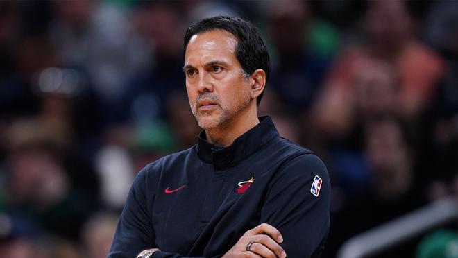 迈阿密热火队主教练埃里克·斯波尔斯特拉在TD花园球馆场边观看球队对阵波士顿凯尔特人队的比赛。