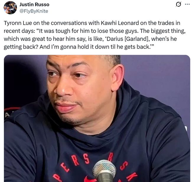 赛后泰伦卢也谈及这一点:“对于小卡来说,失去这些队友确实很艰难,但令人欣慰的是小卡向自己询问加兰何时复出,并且承诺在加兰归队前他会稳住局面。”
