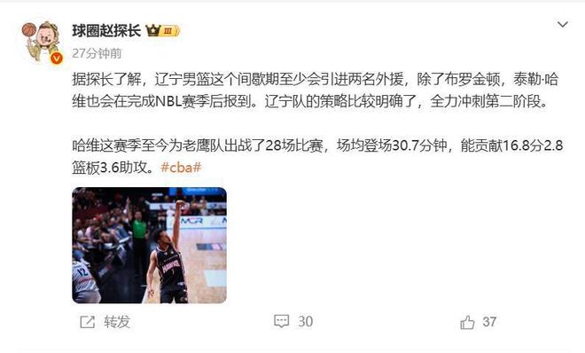 近期辽宁队喜讯连连,在前主教练杨鸣下课后球队不仅走出了连败的泥潭,还花重金新签了两名顶级外援,分别是艾泽亚-布罗金顿和泰勒-哈维;其中泰勒-哈维上赛季效力于上海队,他还曾在季后赛里三分绝杀广东队,非常值得期待。
