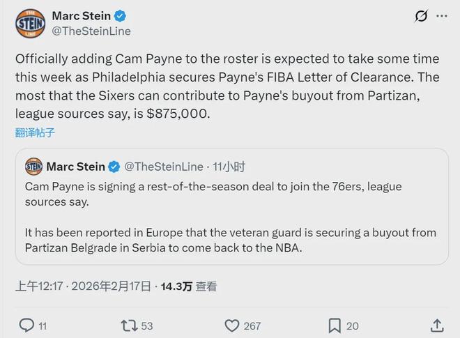 北京时间2月17日,农历大年初一,教主给大家拜年了!最近三天NBA没有比赛,但联盟依然还有不少新闻。今天NBA名记Marc Stein报道,76人将签约后卫卡梅隆-佩恩。佩恩的买断费高达175万美元,但76人最多能付87.5万美元。