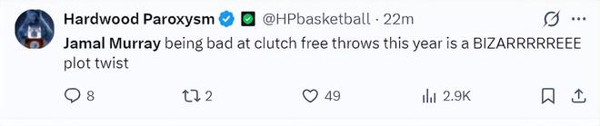 美媒:穆雷今年关键时刻的罚球都不佳,这场比赛他让剧情发生了匪夷所思的转折。