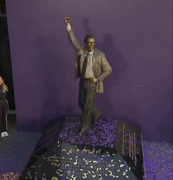 湖人今天在主场前又增加了一个名宿雕像——帕特-莱利雕。