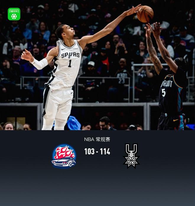 马刺114-103客胜活塞豪取9连胜,文班21+17+6帽,坎宁安26中5得16分