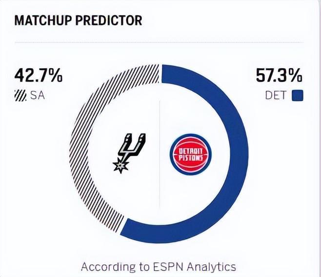 反观马刺,近期的状态火热,凭借一波8连胜,拿到40胜16负的战绩,位居西部第二,与雷霆的差距只有3个胜场,并甩开身后的掘金5个胜场差。马刺队过去两场主场比赛分别击败太阳和国王,延续了连胜势头。上一场对阵国王,马刺以139比122兵不血刃取胜,核心文班亚马延续无解表现,拿下28分15个篮板6次助攻的全面数据,带领球队多点开花、轻松取胜。此役,活塞的杜伦与内线怪物文班亚马的较量,无疑看点十足。赛前,美媒ESPN预测本场比赛,马刺取胜的概率为42.7%,活塞胜率57.3%。
