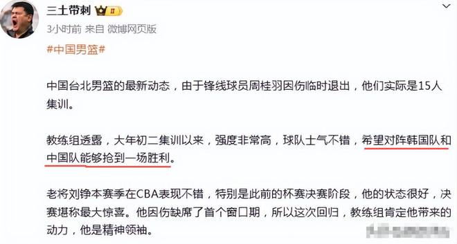 开战之前,台北队也说了一些豪言,陈盈骏接受采访时表示:“上个阶段连输两场对我们来说比较落后,所以这两场我们会全力抢胜。”据报道,中国台北队,由于锋线球员周桂羽因伤临时退出,他们实际是15人集训。教练组透露,大年初二就开始集训,而且强度非常高,球队士气不错。在展望第二窗口期的比赛时,台北教练组说,希望对阵韩国队和中国队能够抢到一场胜利。中国队得小心了,如果战术不得当,发挥失常的话,也有阴沟翻船的可能。