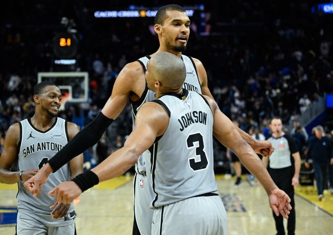 其次,马刺整个阵容框架,确实太凶猛了!场均8人得分上双,文班亚马场均24分+福克斯19分+卡斯尔16.6分+瓦塞尔14.2分+约翰逊13.2分+哈珀11.1分+尚帕尼11分+巴恩斯10.5分,全联盟找不出这么深的阵容配置。他们也有打一大四小的天然配置,首发两个持球点,替补两个持球手,文班亚马也能拉出来投射。但最有趣的一点来了,在12月中下旬三杀雷霆后,马刺一度攀升至NBA实力榜第一。但也就是登顶第一宝座后,他们开始表演,从打爵士起,一直到1月中旬,他们来了一波4胜6负。